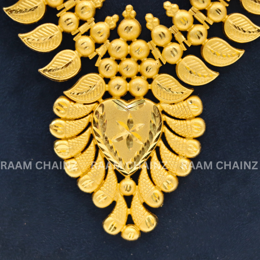 Step into timeless elegance with the Kerala Forming Haram (Mango Leaf) a masterpiece inspired by the natural beauty of mango leaves, which symbolize auspiciousness in Indian culture. This two-line haram set captures the soul of South Indian heritage while adding a luxurious yet lightweight charm to your traditional wardrobe. Whether for a wedding, festival, or cultural celebration, this set promises to elevate your ensemble with unmatched grandeur.